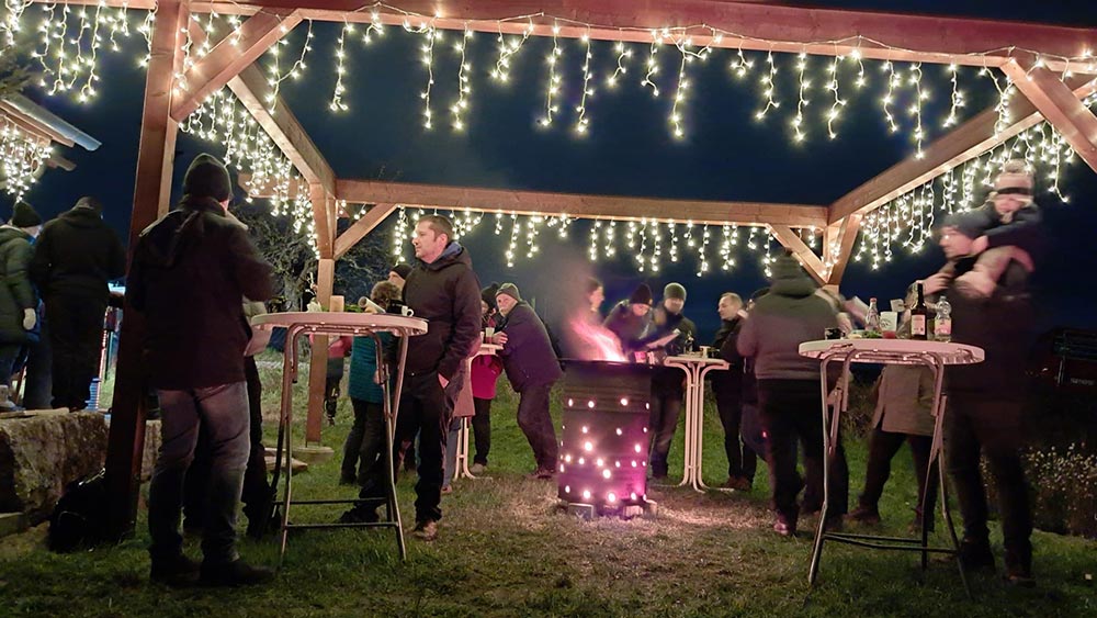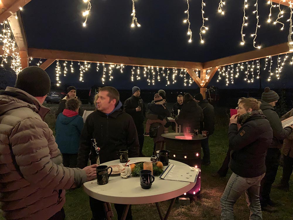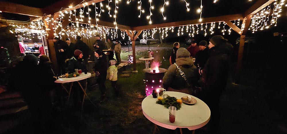 Bei Glühwein und Punsch genießen wir die besondere Atmosphäre: Feuerkörbe spenden wohlige Wärme, während idyllische Beleuchtung den Platz in stimmungsvolles Licht hüllt. Gesangstalente sorgen mit bekannten Weihnachtsliedern für festliche Klänge, und bei netten Gesprächen klingt das Vereinsjahr in geselliger Runde aus.